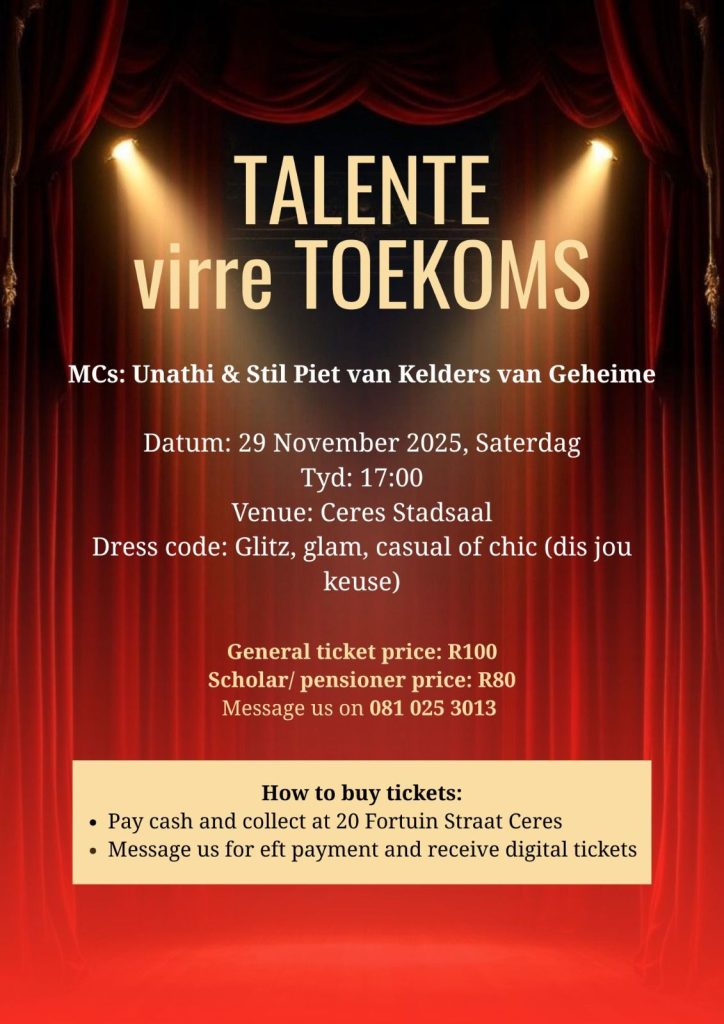 Talente virre Toekoms bring jou ‘n aand vol musiek, dans en toneelspel – ‘n produksie wat hoop, kreatiwiteit en gemeenskap vier.